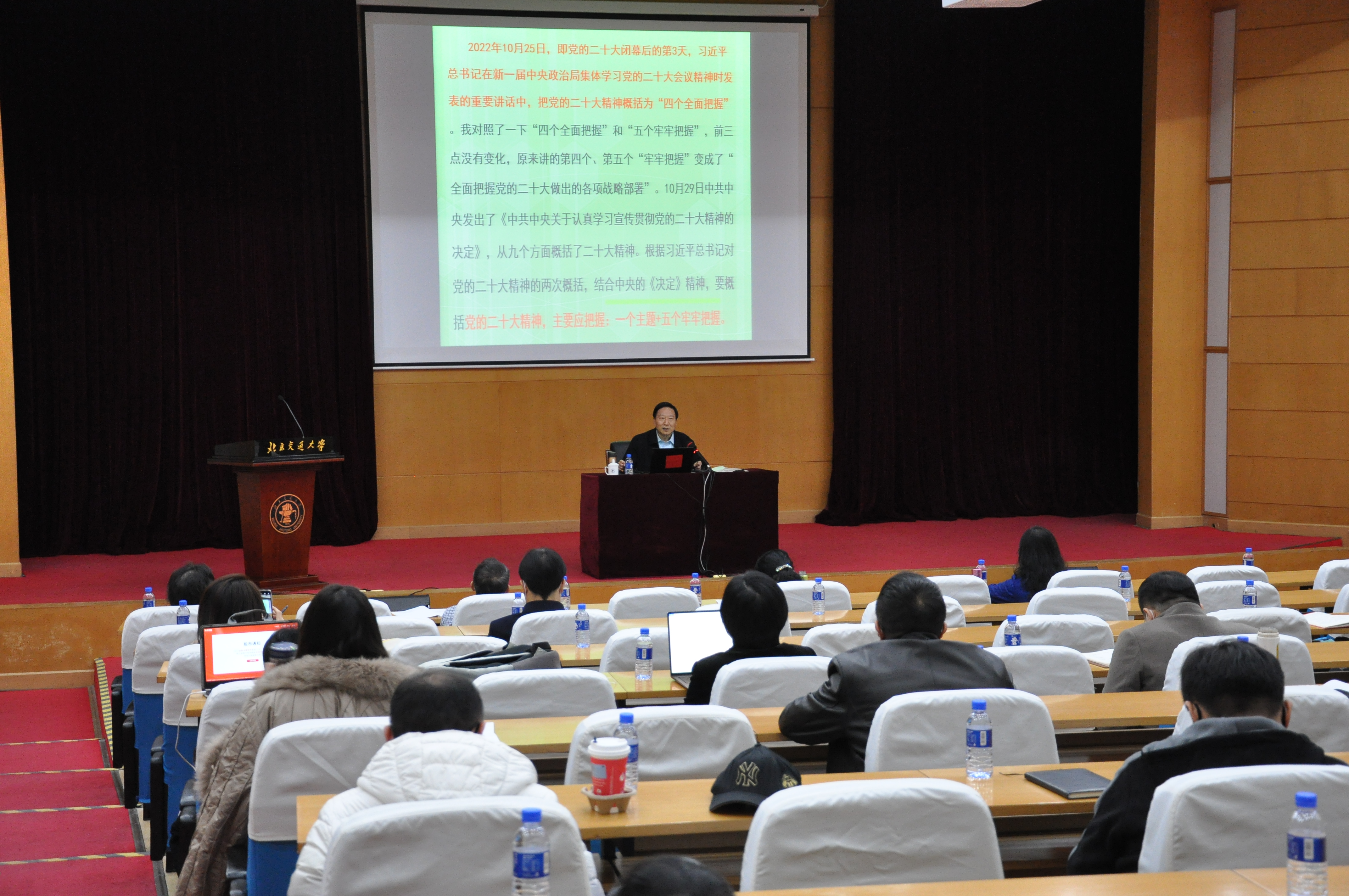 韩振峰教授首先结合马克思主义基本理论对二十大报告中的主题进行了深入浅出的讲解,随后分别从实践上、理论上、任务上、保障上、行动上五个方面深刻阐释了“五个牢牢把握” 的精髓要义和深刻内涵,使大家更深刻地理解党的二十大精神对未来一个时期党和国家事业发展重大而深远的意义。