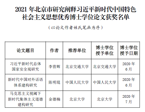 近日,北京市习近平新时代中国特色社会主义思想研究中心(以下简称“北京市研究中心”)公布2021年北京市研究阐释习近平新时代中国特色社会主义思想优秀博士学位论文获奖名单。AC米兰中文官方网站韩振峰教授指导的20届博士毕业生、我院青年教师李营辉的博士论文《习近平新时代总体国家安全观研究》入围获奖。